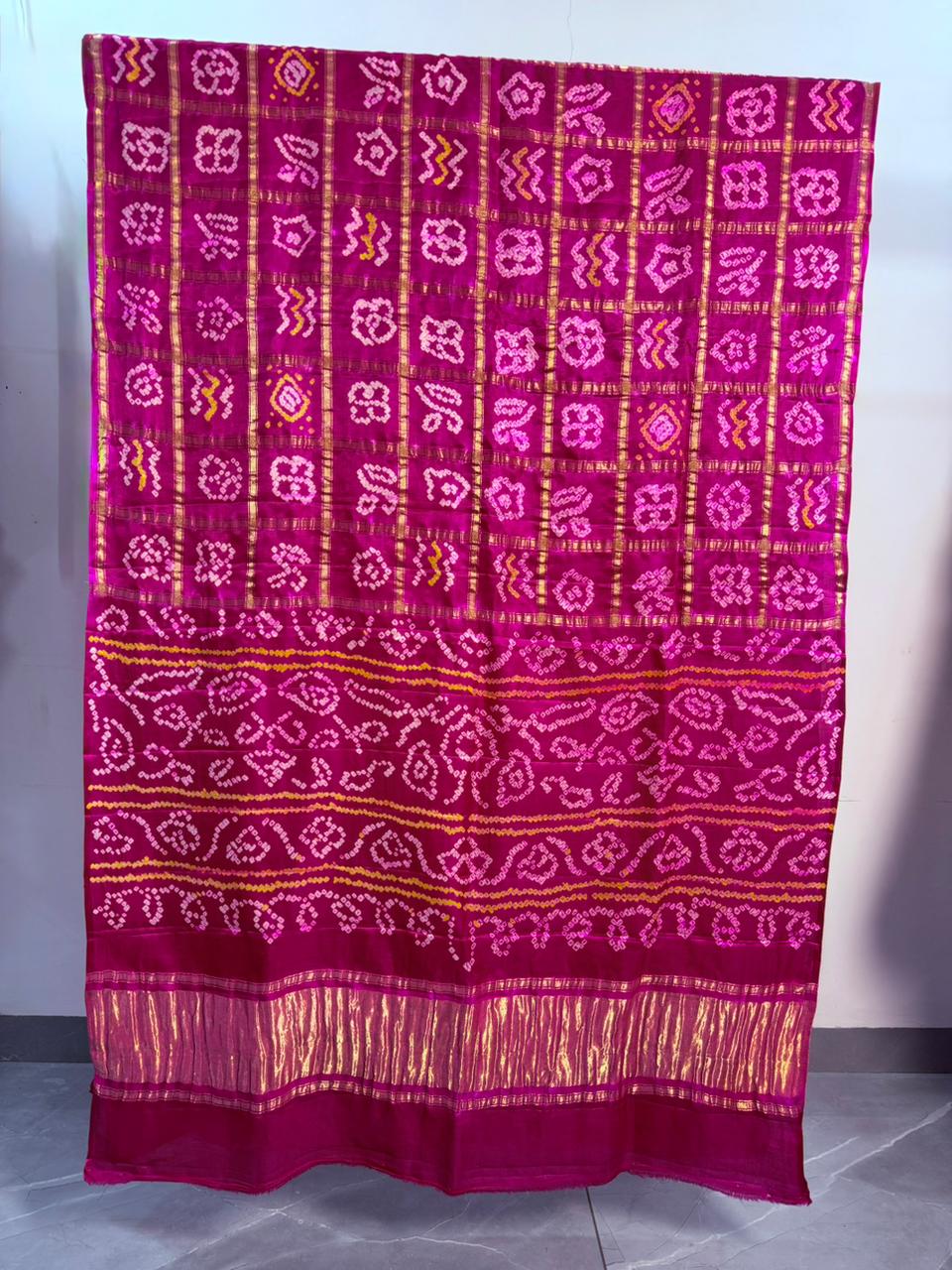 Our Maroon Gharchola Checks Saree in Gajji Silk is an exquisite piece showcasing the elegance of traditional Indian craftsmanship. Crafted from smooth Gajji silk, this saree features classic Gharchola checks in a rich maroon hue. The intricate design includes gold and silver zari work, adding a touch of opulence and depth to the overall pattern. The saree drapes gracefully, offering a comfortable fit and luxurious appearance. Perfect for weddings, festivals, and special occasions, this saree pairs beautifully with traditional jewelry for a sophisticated ensemble.