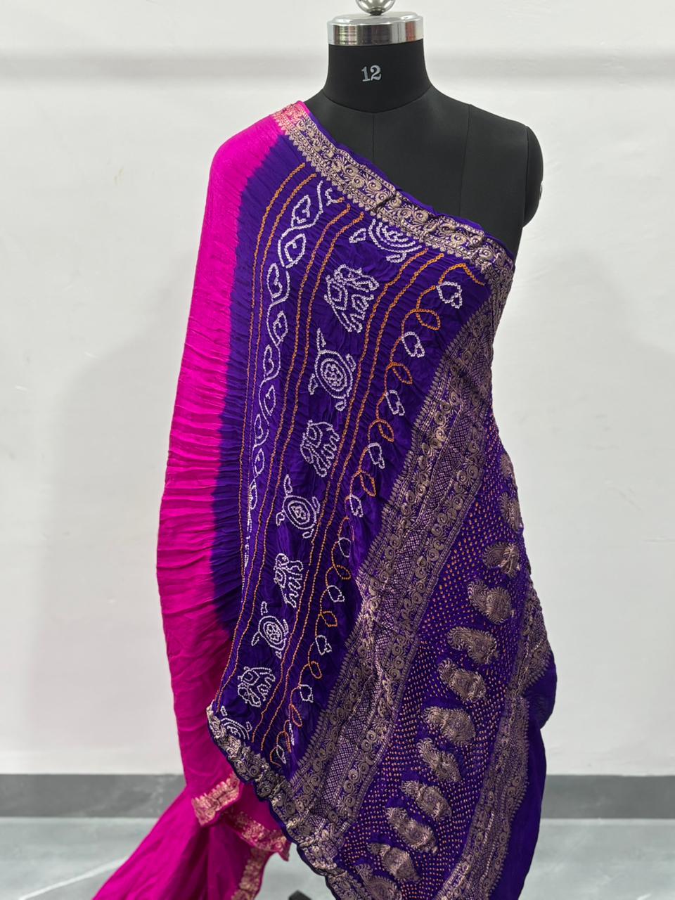 Indulge in royal elegance with this stunning Pure Gaji Silk Kasumbo Nakshi Border Raibandhej Saree, crafted to reflect timeless tradition and refined artistry. The rich royal purple base is beautifully paired with a vibrant rani pink pallu, creating a striking contrast that exudes grandeur.
